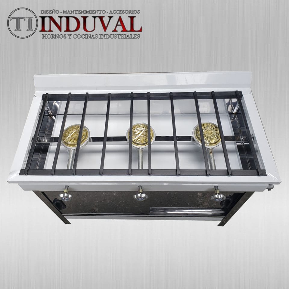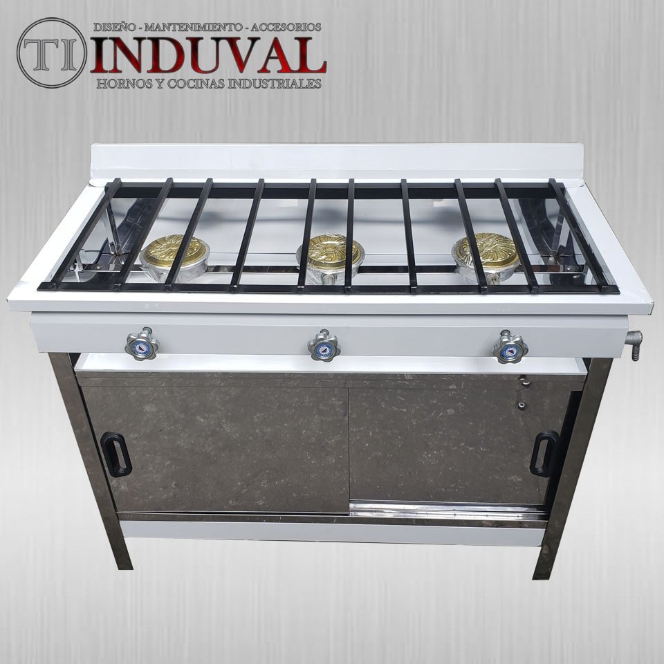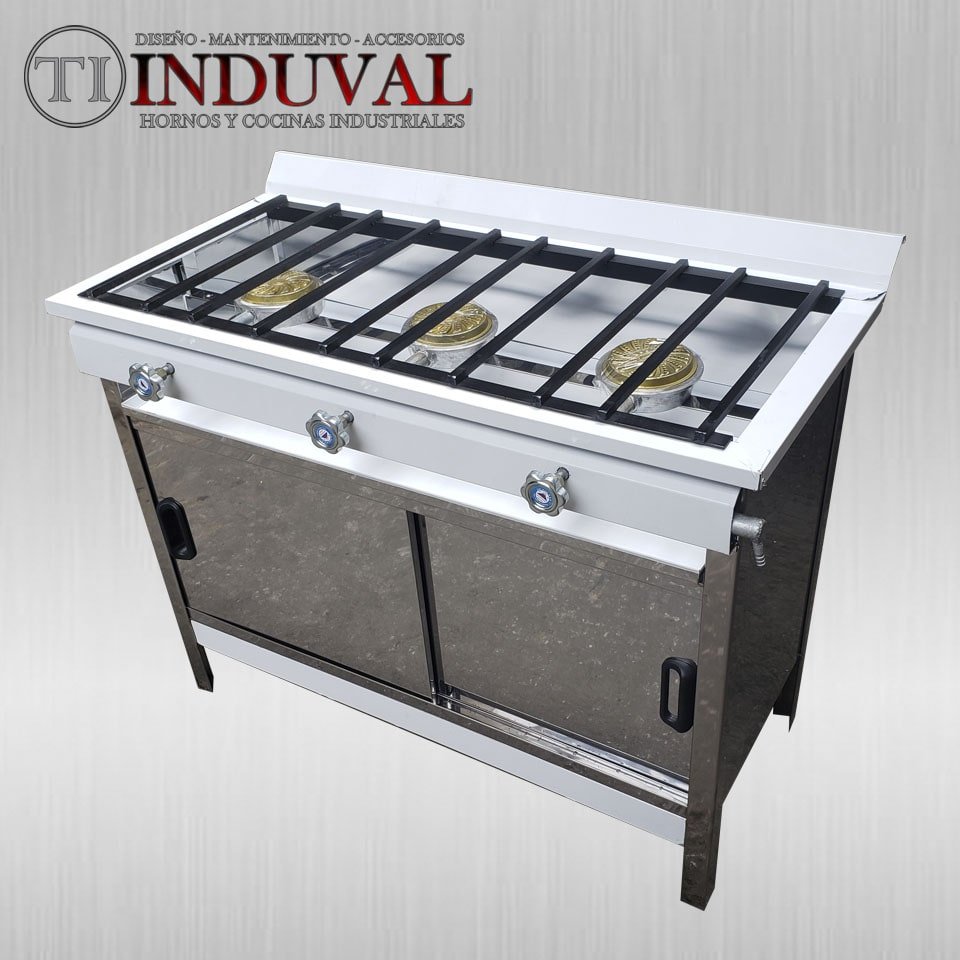 Cocina de 3 quemadores en acero inoxidable 0.4mm. Dimensiones: 100cm x 45cm x 75cm.