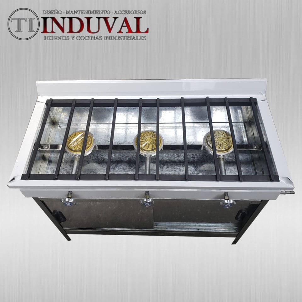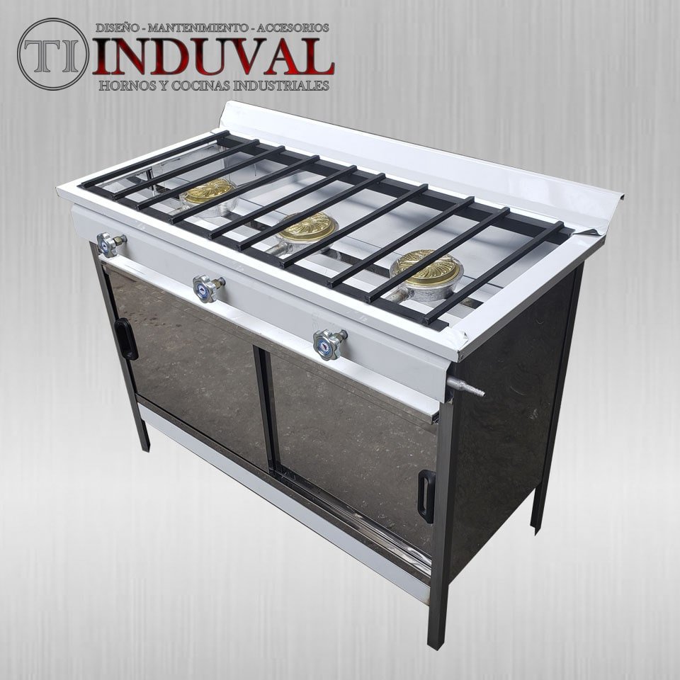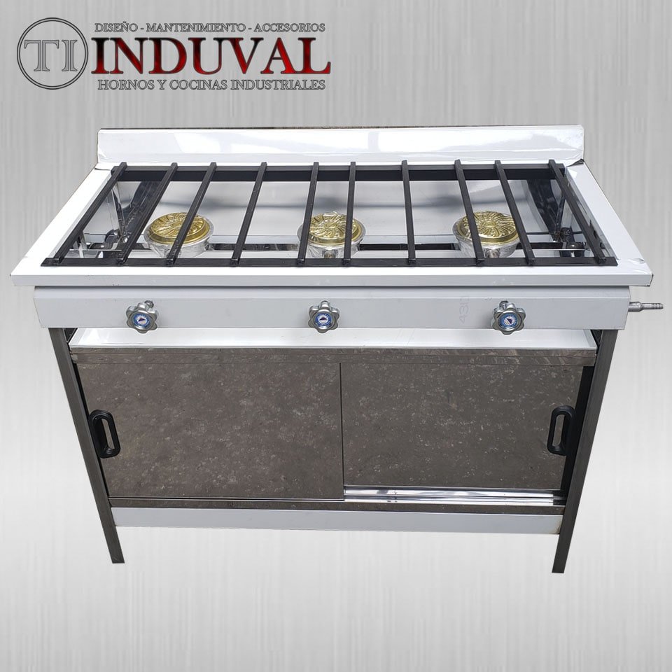 Cocina de 3 quemadores en acero inoxidable 0.4mm. Dimensiones: 100cm x 45cm x 75cm.